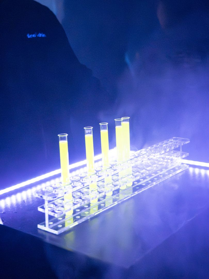 Fluoreszierender Hot Shot im Dunkel-Tunnel, serviert im Reagenzglas: