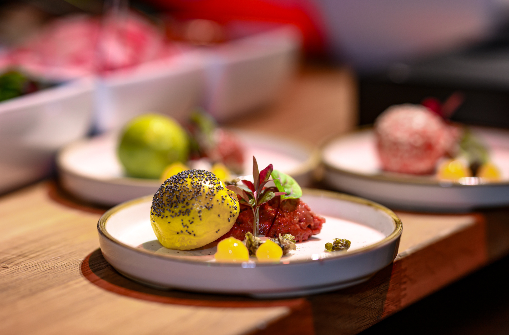Live-Station: Frisch gewolftes Rindstatar, Lachs auf Kartoffelwaffel & Beeren-Variationen im Stickstoff-Nebel.